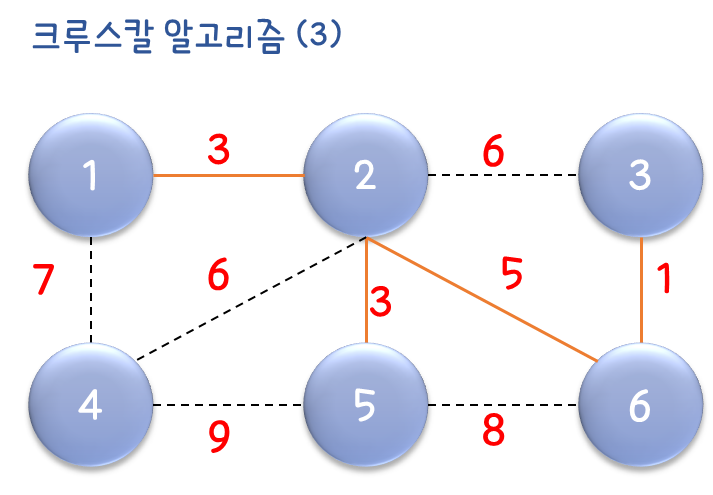 2. 정렬된 간선 리스트를 순서대로 선택하여, 간선의 정점들을 연결합니다.