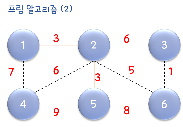 2와 연결된 3, 4, 5, 6 정점을 우선순위 큐에 삽입하고 우선순위 큐에 삽입된 정점 중에 2, 5가 가장 낮은 정점을 가지고 있으므로 2, 5 연결