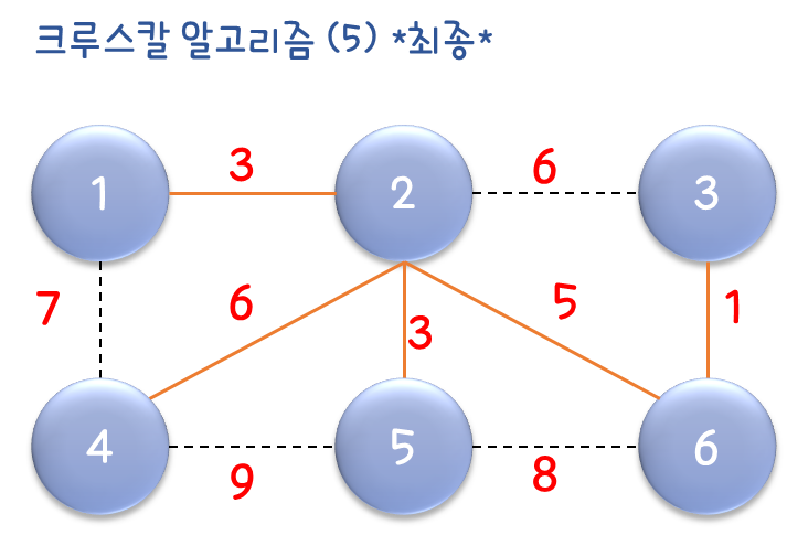 4. 위의 과정을 모든 정점이 연결될 때까지 반복을 하여 최소 비용으로 모든 정점을 연결합니다.