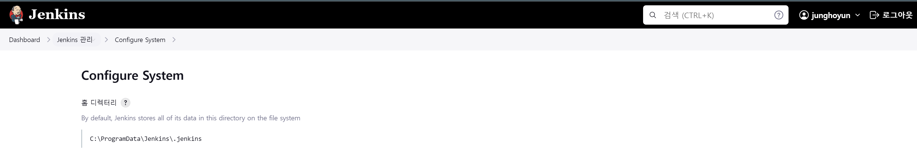 Dashboard > Jenkins 관리 > Configure System(시스템 설정)에서 홈 디렉터리를 보시면 확인할 수 있습니다. (변경가능)