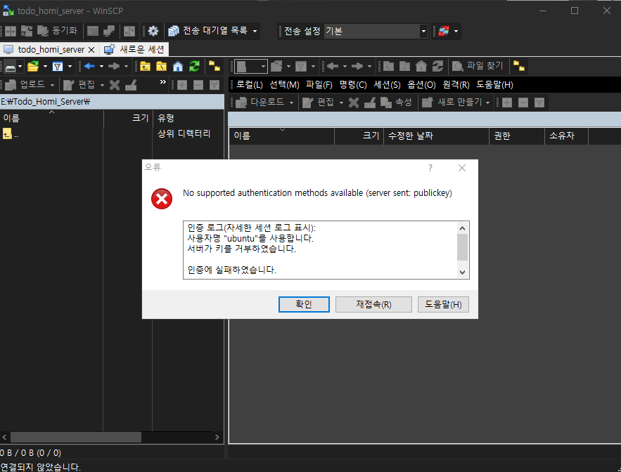 5. 서버가 키를 거부하였습니다. 아래의 오류가 나타나면서 서버가 키를 거부했습니다.