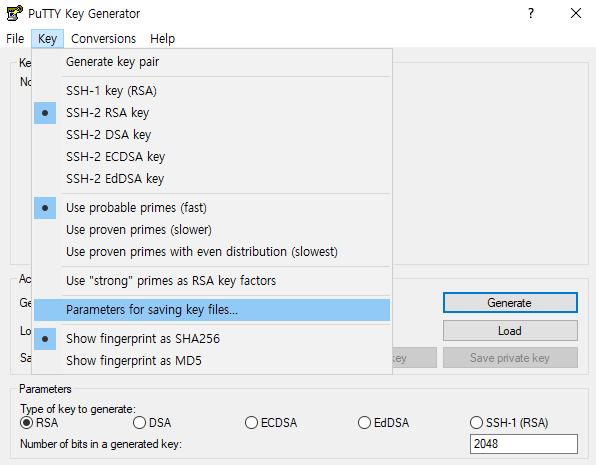 1. PuTTYgen 실행하여 Parameters for saving key files... 클릭