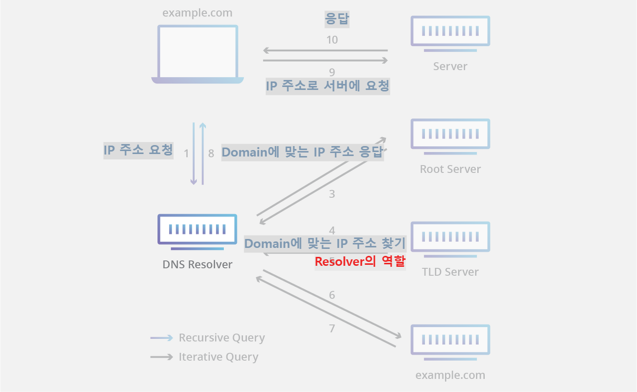 - 캐시되어 있다면 IP 주소를 반환하고 없다면 Iterative Query를 각각의 DNS서버에 보내서 Domain에 맞는 IP 주소를 찾습니다.