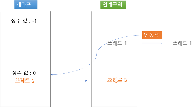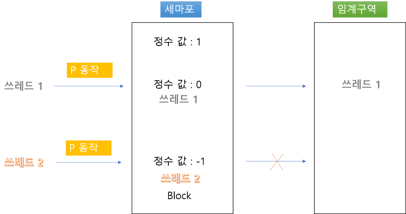 정수는 초기에 1로 되어있고, 쓰레드가 들어오면 acquire()를 호출해서 정수 값을 감소시킵니다. 그럼 정수 값은 0이 됩니다. 정수 값이 0인 쓰레드는 임계 구역에서 작업을 수행하고 있음을 의미합니다. 그리고 쓰레드가 하나 더 임계구역에 접근하려고 하면 acquire()을 호출해서 세마포어에 들어오는 쓰레드의 정수 값이 -1이 됩니다. 정수 값이 0보다 작은 쓰레드는 대기 시킵니다. 그리고 처리되고 있던 0번 쓰레드가 작업이 끝나면 release()를 호출하면 다른 쓰레드들의 정수값을 모두 1증가시킵니다. 그러면 -1 이었던 쓰레드가 0이되고 그 쓰레드가 임계구역에 들어가서 작업을 수행하게 됩니다.