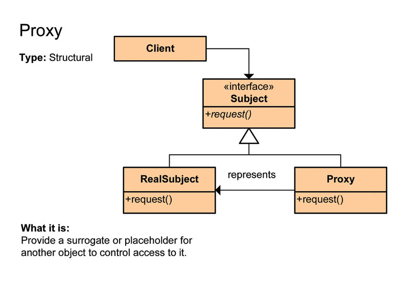 대리인 이라는 뜻으로, 대신해서 처리하는 것을 말합니다. Proxy Class를 통해서 대신 전달하는 형태로 설계되며, 실제 Client는 Proxy로 부터 결과를 받습니다. 또한 Cache의 기능으로도 활용이 가능합니다. OCP와 DIP를 따릅니다.